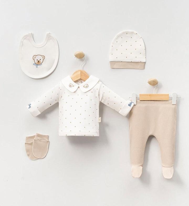 Apportez douceur et élégance à votre bébé avec cet ensemble 5 pièces conçu pour offrir confort et praticité au quotidien. Parfait pour les nouveau-nés, cet ensemble charmant avec un adorable motif ours comprend :