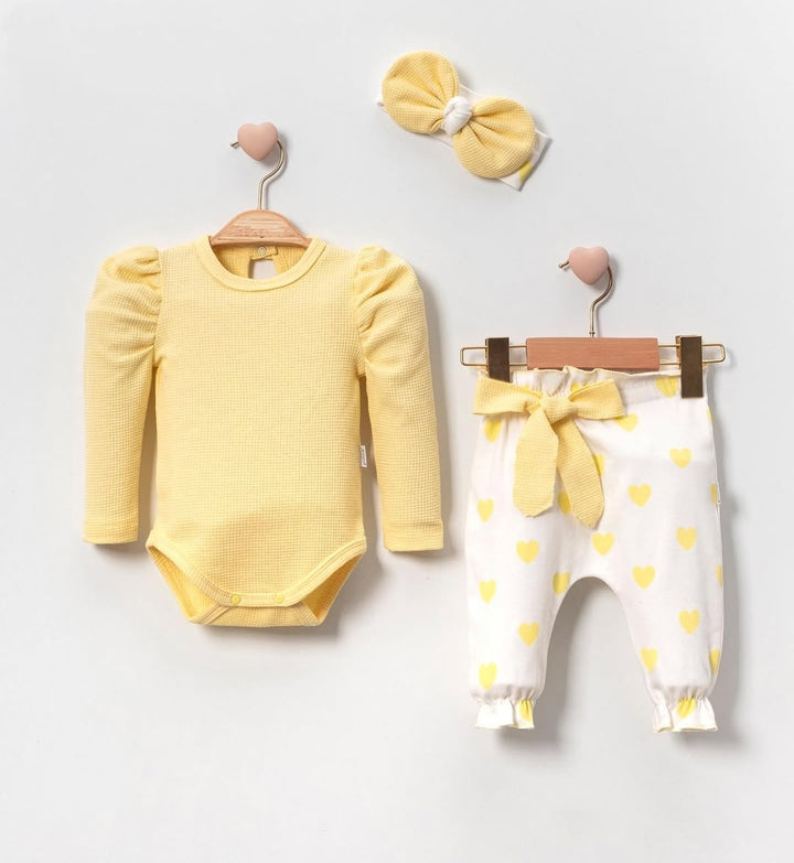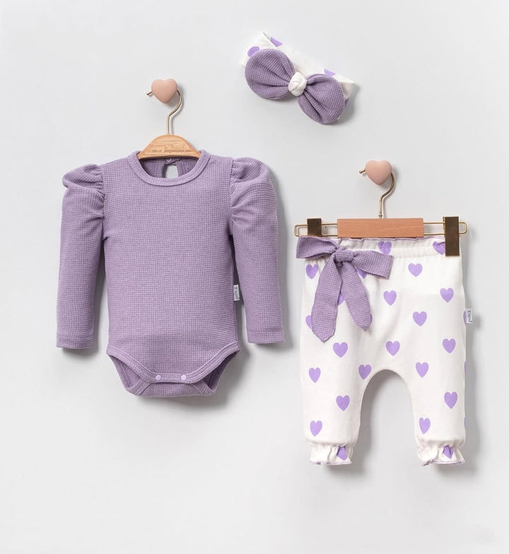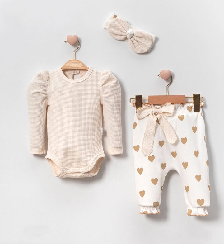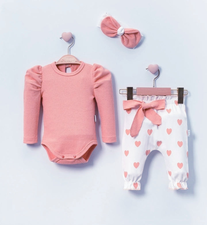 Offrez à votre petite fille un look adorable et confortable avec cet ensemble 3 pièces à motif cœur. Fabriqué en coton biologique certifié OEKO-TEX, cet ensemble est parfait pour les bébés de 3 à 18 mois et comprend :