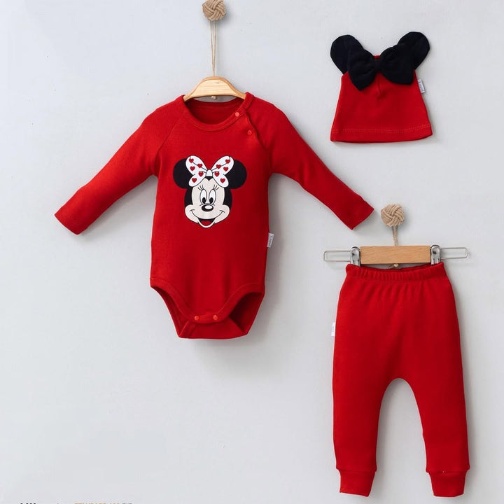 Habillez votre petite princesse avec cet adorable ensemble 3 pièces Minnie Mouse, alliant style et confort. Fabriqué en coton biologique certifié OEKO-TEX, cet ensemble rouge iconique comprend :