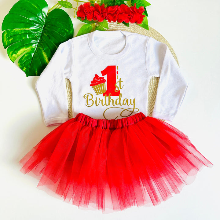 Robe Premier Anniversaire 12 Mois 1 An Manche Longue 3 Pièces Rouge doré brillant.